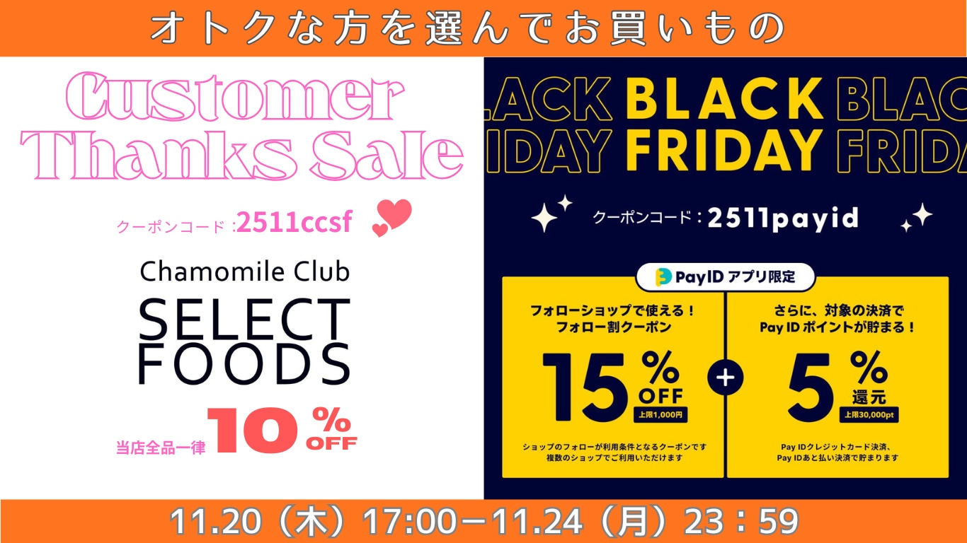 11月20日(木)17:00より、BASEよりブラックフライデーのクーポンが発行されますが、<PayID>アプリ限定となりますため、タイミングを同じくして当店からのThanksクーポンも発行することとしました。<PayID>クーポンは割引率も大きいですが上限額(1,000円)がありますので、ご利用環境やお求めになる価格によってお得な方をお選びいただけます。