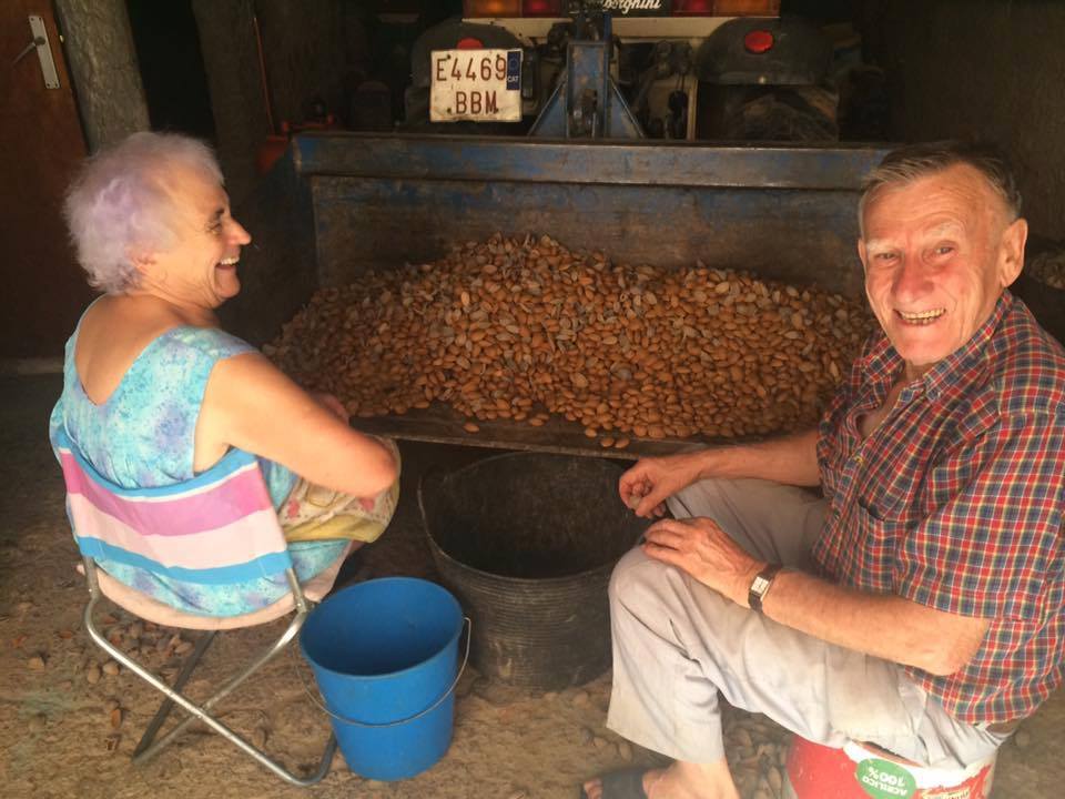 収穫方法は、木をゆすってアーモンドの実を落とし、手が届かない部分は現在でも長い竿を使って採っています。高齢化の進む村々でもお年寄りたちが元気に働いています。
